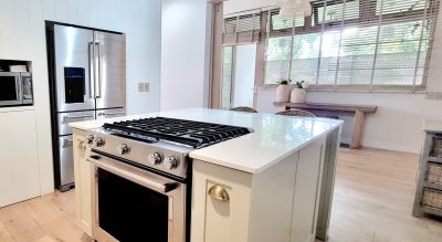 Cocina integral con isla y barra de cuarzo