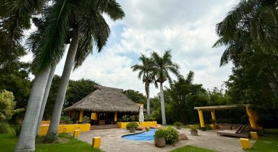 - Terraza principal con cocina integral, baños, alberca y bodega